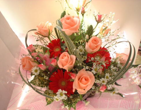 ベージュ色の薔薇にピンクのスプレー薔薇 カスミソウや白の小花、赤のガーベラなどで アレンジをしました 発表会や送別に、退職のお祝いなどにも♪ 商品番号B-6a H25W20 価格4,200円(税込) 戻る